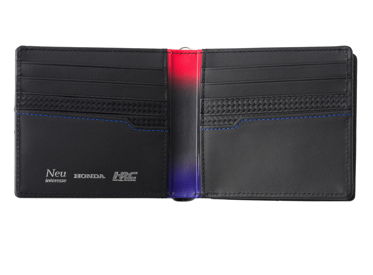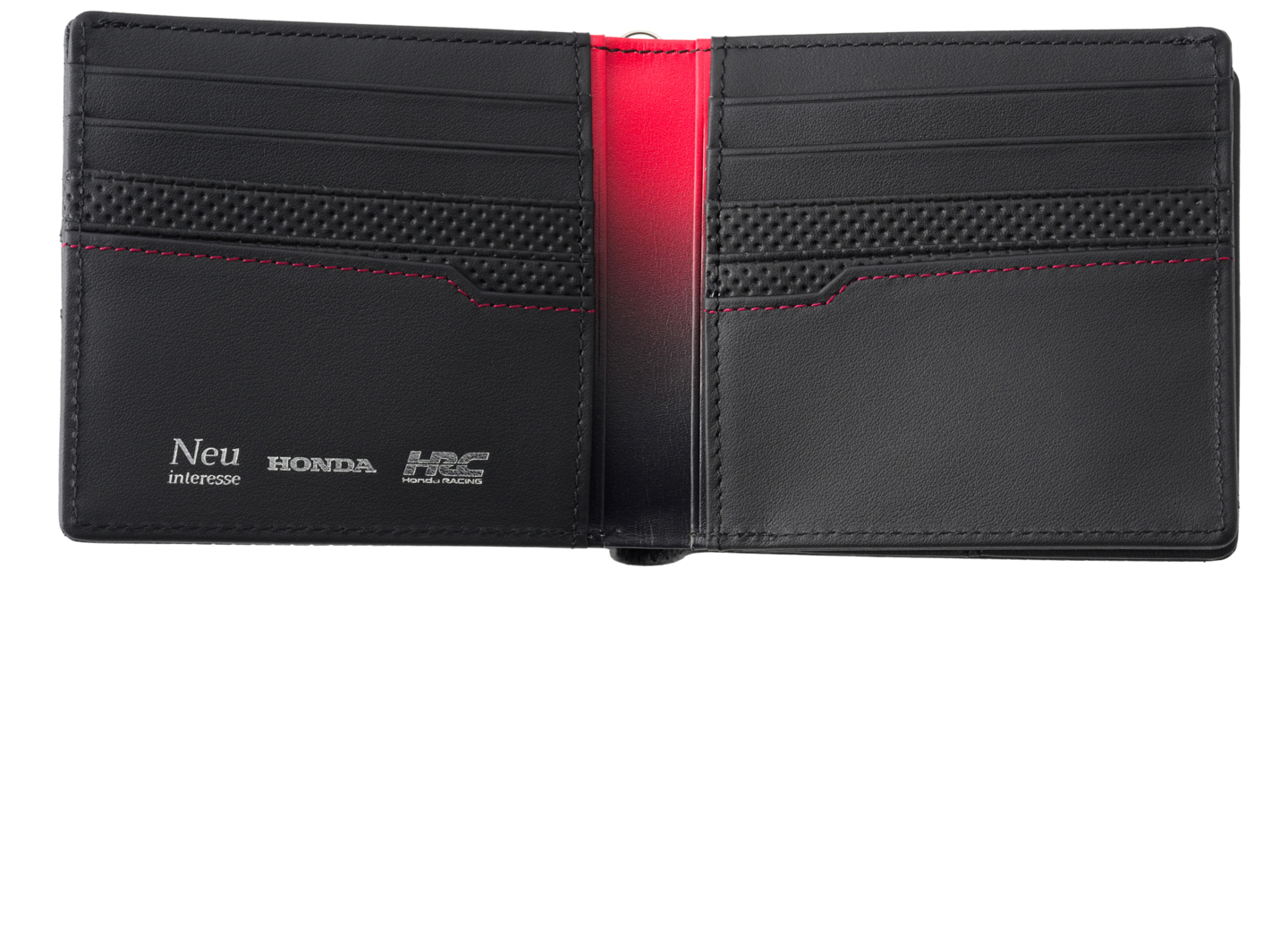 Hondaのモータースポーツ活動を象徴するHRCロゴを使用した公認ライセンスグッズ。Neu interesseのアイテムを通して、レースに情熱を注ぐHondaの世界観を表現。レザーアイテムのメイン素材には、植物由来の薬品を使用し、国内のLWG認証を取得したタンナーにて鞣されたヌメ革を採用。ディンプルパターンやカーボンパターンのエンボス加工を施すことで、上質さとスポーティさを兼ね備えた表情に仕上げています。環境にも配慮した、サステナブルな素材選びが特徴です。バッグには機能性に優れた無駄のないデザインに、グラデーションプリントを施したファスナーを採用。撥水加工を施した高密度1680Dポリエステル素材により、優れた耐久性と機能性を実現。それぞれデザインの一部として取り入れたグラデーションによって、モータースポーツのスピード感とダイナミズムを力強く表現しています。