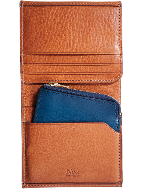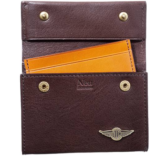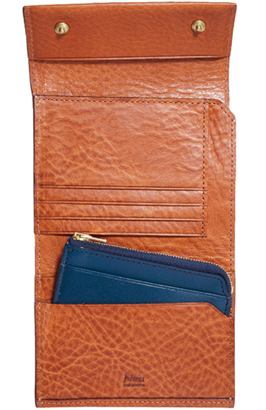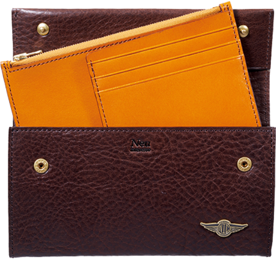 The Gechichte employs the leather by a nationally recognized tanner, Tochigi Leather, who is specialized in full-vegetable tanning.Crafted in oiled vachetta leather with the Neu interesse original embossed pattern, it creates an image of classic British motorsport.The detachable accessory in color gives accent to it. Supple yet tough, this series utilizes the characteristics of the material, which ages richly over time.