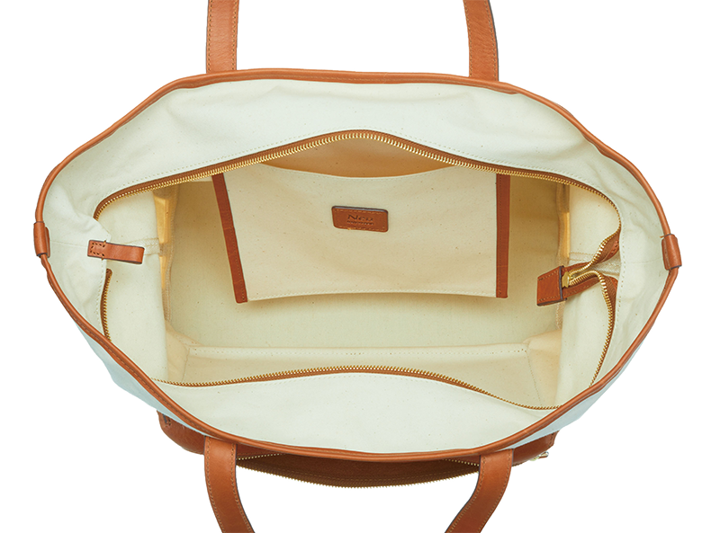 Impregnated with wax, pre-dyed No.9 (15oz) canvas by Kurashiki Canvas from Okayama prefecture becomes waterproof yet maintains its breathability, durability and suppleness as natural fabric. Oiled vachetta leather embossed with the original Neu interesse pattern is used for the front pocket, handles and trim. By designing to utilize the characteristics of each material, this series has achieved to create an image of classic British motorsport.