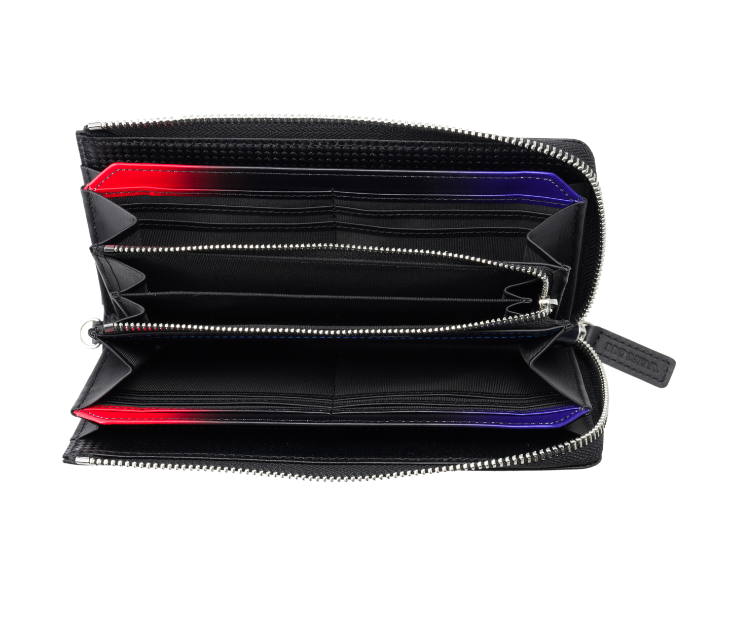 Hondaのモータースポーツ活動を象徴するHRCロゴを使用した公認ライセンスグッズ。Neu interesseのアイテムを通して、レースに情熱を注ぐHondaの世界観を表現。レザーアイテムのメイン素材には、植物由来の薬品を使用し、国内のLWG認証を取得したタンナーにて鞣されたヌメ革を採用。ディンプルパターンやカーボンパターンのエンボス加工を施すことで、上質さとスポーティさを兼ね備えた表情に仕上げています。環境にも配慮した、サステナブルな素材選びが特徴です。バッグには機能性に優れた無駄のないデザインに、グラデーションプリントを施したファスナーを採用。撥水加工を施した高密度1680Dポリエステル素材により、優れた耐久性と機能性を実現。それぞれデザインの一部として取り入れたグラデーションによって、モータースポーツのスピード感とダイナミズムを力強く表現しています。